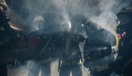 Group of firefighters after fire. Brave teamwork for fire safety and community protection