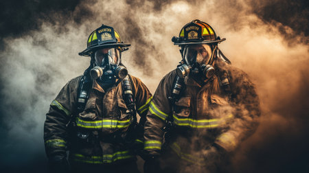 Two firefighters posed in heavy smoke, dramatic lighting highlights their determination and bravery. Perfect for emergency response visuals