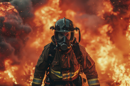 A firefighter in protective gear confronts a blaze, surrounded by billowing smoke and red flames, showing bravery.