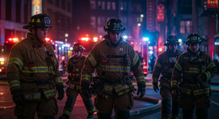 a group of firefighters walking towards the camera at night with emergency lights flashing in the background ready to tackle any challenge ahead of them