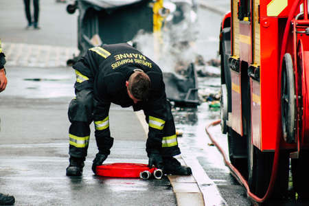 Reims France May 18, 2019 View of firefighters extinguishing a construction hut burned by rioters during protests of the Yellow Jackets in the streets of Reims on saturday afternoon