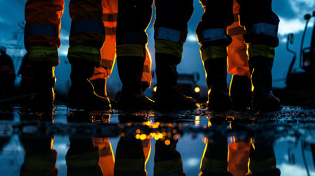 Silhouettes of workers gather together their vibrant reflective tape on their boots and hard hats providing a stark contrast against the dark sky