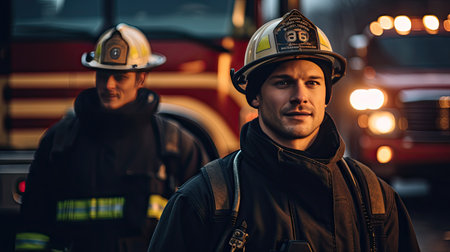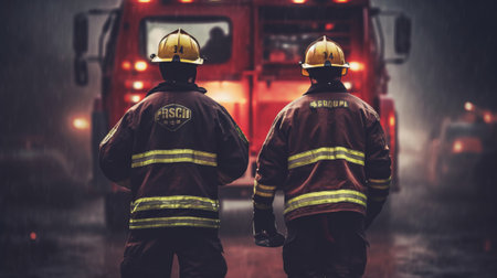 Firemen in uniform and helmet near fire engine back view. Generative AI.