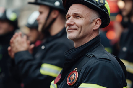 A firefighter stands proudly with a smile, surrounded by fellow firefighters at a recognition ceremony in a bustling city, showcasing camaraderie and dedication.
