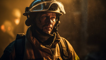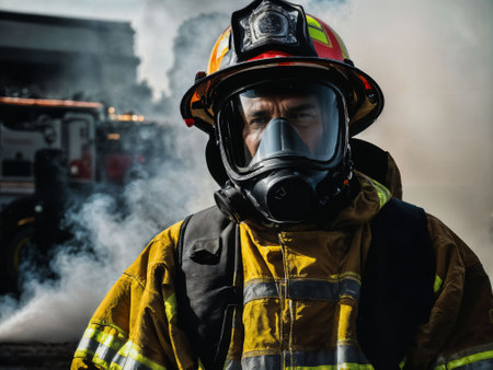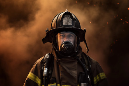 Confident firefighter, adorned in protective gear. His face smudged with soot and determination, standing tall amidst billowing smoke, ready to battle the flames. Generative AI