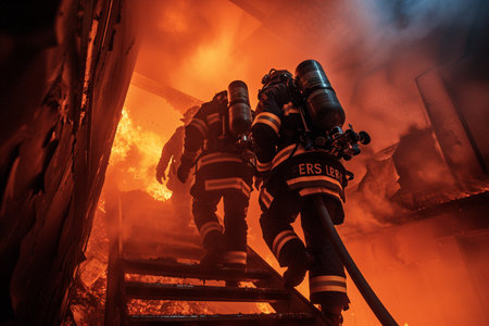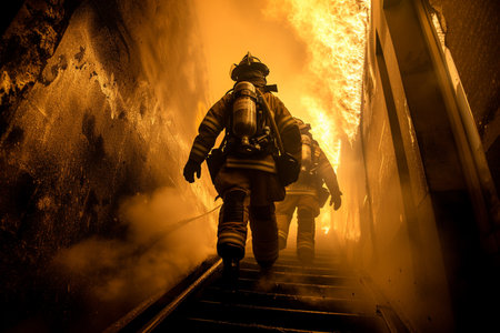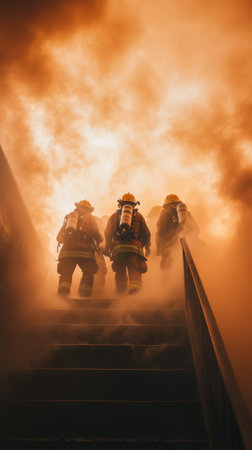 Brave firefighters navigating smoke filled stairs during a perilous fire emergency, showcasing unwavering courage and dedication while battling the intense flames and heat