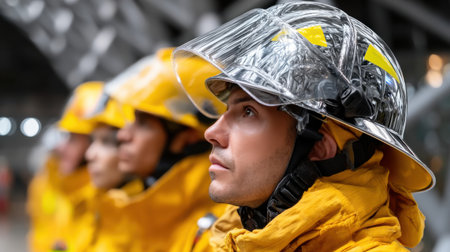 A group of firefighters are standing in a line, all wearing yellow helmets. Concept of unity and teamwork among the firefighters, as they are all dressed in the same uniform