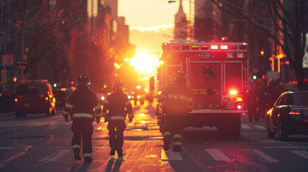Firefighters and an ambulance in a city setting during sunset, highlighting emergency response and urban life