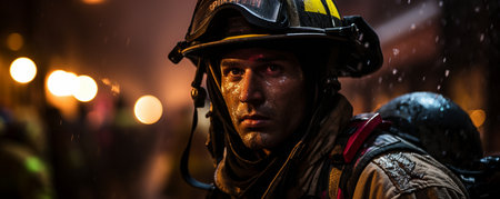 Close up Male Firefighter in Full Gear Ready for Duty, Standing in Front of a camera. Portrait of a Brave. High quality