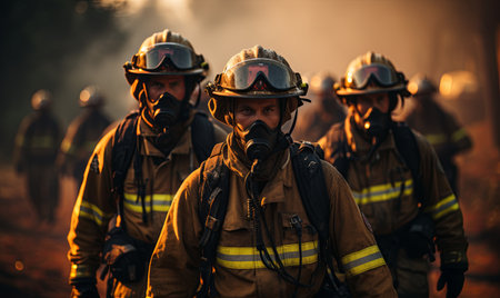 A group of firefighters in full gear walking through a forest, ready to combat wildfires and protect the natural habitat.