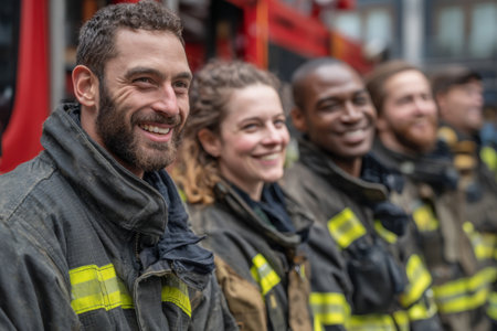Firefighters are gathered outdoors, smiling and posing together. They wear gear and stand in front of a fire truck. The scene shows a sense of camaraderie and pride in their work.