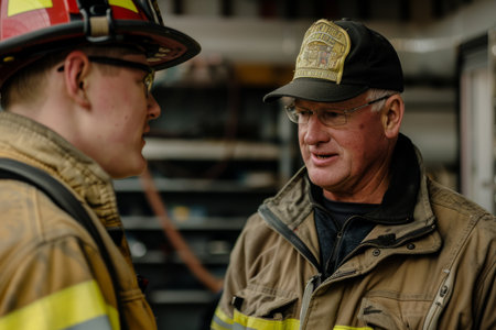 A firefighter mentoring a new recruit at the fire station, sharing wisdom and experience gained from years of service, his guidance shaping the next generation of firefighters and instilling values of courage, integrity, and camaraderie.