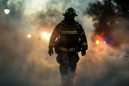 A firefighter navigates through thick smoke with emergency lights flashing in the background at dusk.