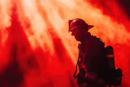 A firefighter prepares for action, silhouetted against vibrant red smoke, showing bravery and determination.