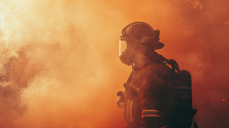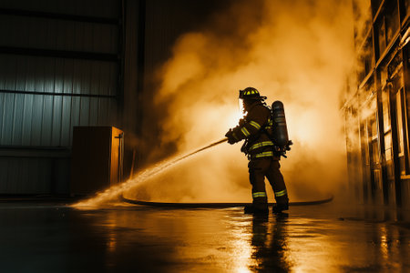 A dedicated firefighter confronts a fierce blaze, wielding a powerful hose as billowing smoke envelops the room. Generative AI