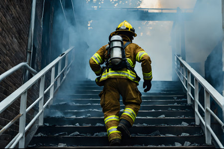 Brave firefighters navigating smoke filled stairs during a perilous fire emergency, showcasing unwavering courage and dedication while battling the intense flames and heat