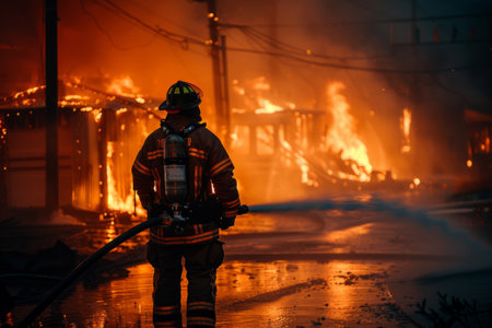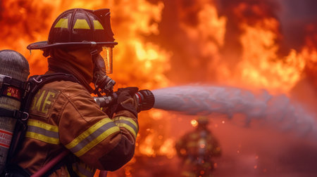 911. Firefighters at work against the backdrop of a raging flame. Emotive pictures highlighting the teamwork and unity among firefighters as they work together to overcome fire-related challenges.