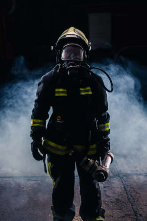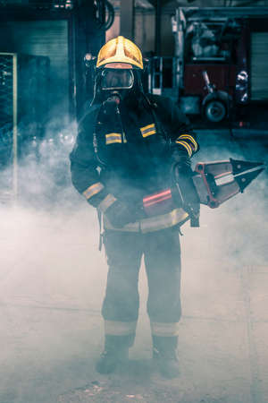 Portrait of a female firefighter wearing a helmet and all safety equipment a while holding a tomahawk and wearing an oxygen mask indoors surrounded by smoke