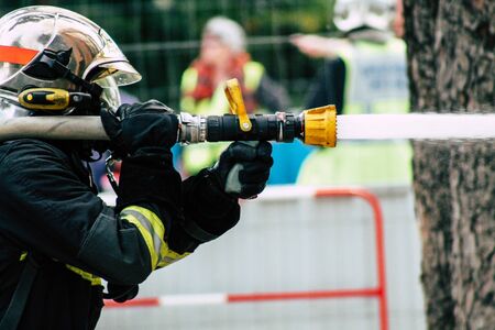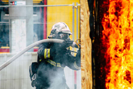 fireman in protective clothing extinguishes a fire