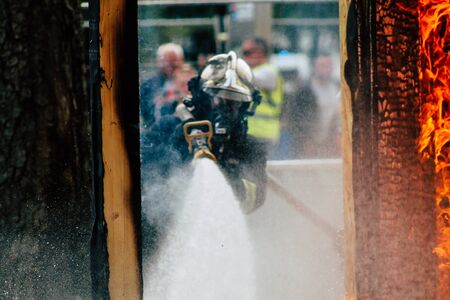 Firefighter in fire fighting action. Firefighter in fire fighting equipment.