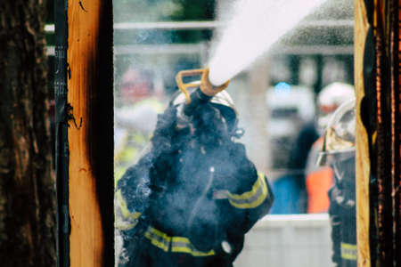 Reims France May 18, 2019 View of firefighters extinguishing a construction hut burned by rioters during protests of the Yellow Jackets in the streets of Reims on saturday afternoon