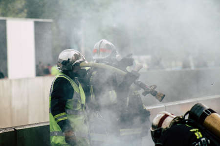 Firemen in a fire-fighting training exercise