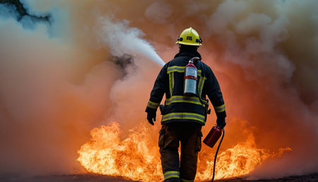 Firefighter in action with a fire extinguisher in the background.