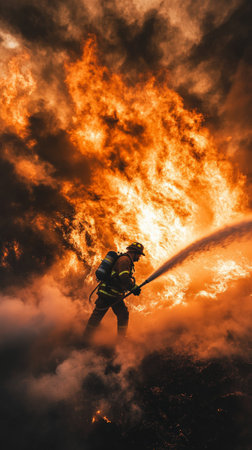 Brave firefighter battling intense wildfire, using high pressure water jet against raging flames and dense smoke, demonstrating courage and skill in dangerous profession