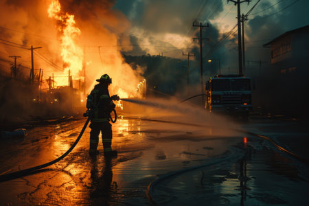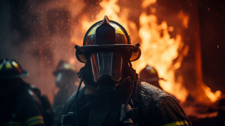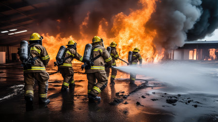 Firefighters battling blaze, intense flames, teamwork in action, heroic atmosphere