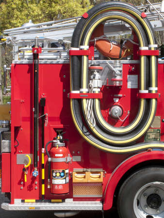Side view of red municipal fire engine standing idle. Many equipment packed neatly inside a fire truck.