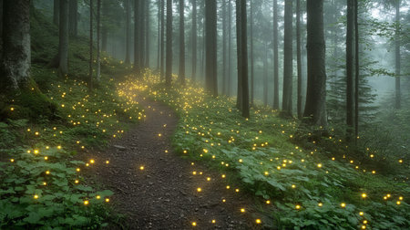 Enchanting forest path illuminated by glowing fireflies