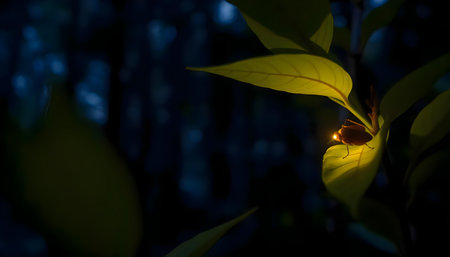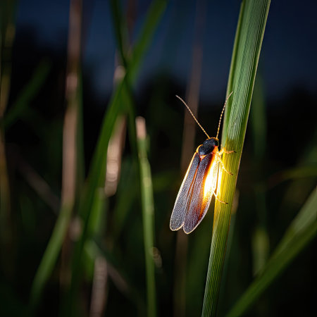 Macro shot of a firefly glowing in the dark, illuminating the night with its bioluminescence