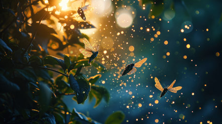 A mesmerizing scene showcasing glowing fireflies illuminating a serene forest landscape during twilight. Ideal for nature and magic-themed projects.