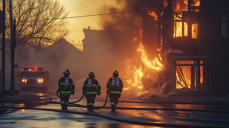 Three firefighters advance toward a blazing building, showcasing bravery and teamwork in response to an urban fire emergency with smoke and flames.