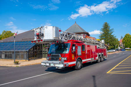 Fire Truck patrol on Veterans Square in downtown Laconia, New Hampshire NH, USA.