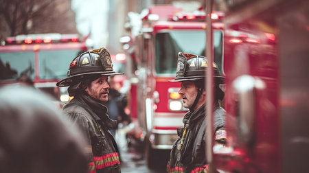 Two adult firefighters wear protective gear and helmets while communicating, standing in front of fire trucks with red lights flashing, symbolizing teamwork and duty during an emergency