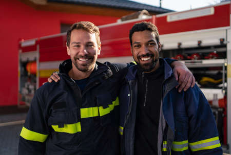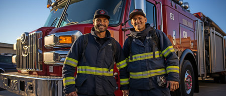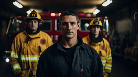 Firefighters standing in front of fire truck background.