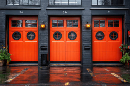 Three Bright Orange Garage Doors with Circular Windows