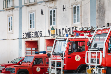 Faro, Portugal - May 01, 2018: Fire trucks parked in front of a volunteer fire station on a spring day