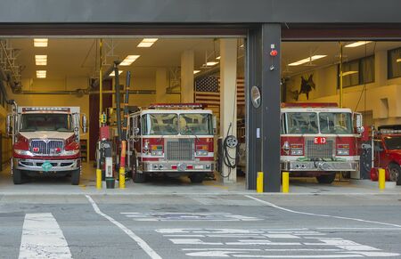 New York, USA - June 6, 2019: fire trucks is parked in the fire station in Manhattan