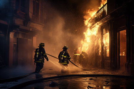 Firefighters extinguishing a fire in a building at night Ai generated