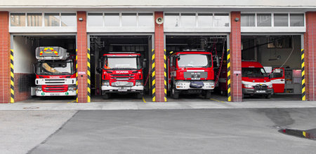 Prostejov, Czech Rep, Aug 14th 2017. Red fire fighter trucks parked in open garage. Fire brigade of the Czech republic. Firefighter special vehicle