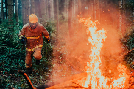 Firefighter extinguishing a fire with a fire hose in a burning forest