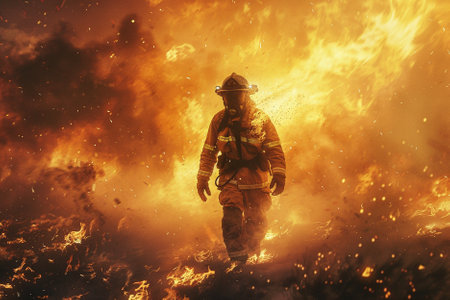 A dedicated firefighter walks through a wildfire, battling flames and smoke in a tense situation.