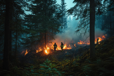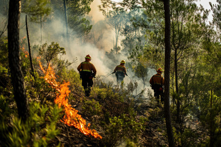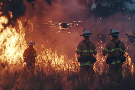 Firefighters work diligently to control a raging forest fire while a drone provides aerial support.