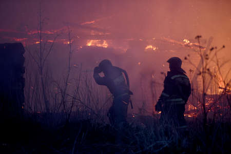 Silhouette of Firemen fighting a raging fire with huge flames of burning timber