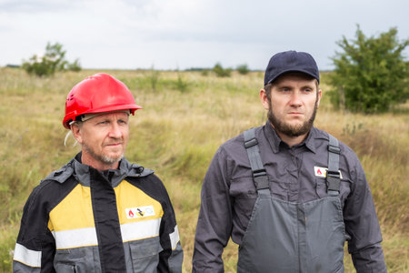 Portrait of two municipal workers in uniform and helmet, with beards and a serious look.