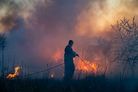 Firefighter extinguishing a fire in the field. Firefighters fighting a fire.