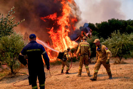 forest fires at sunrise near the area Ancient Olympia, Peloponnese, Greece on August 5, 2021