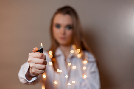 girl with a lighter on a gray background in a shirt